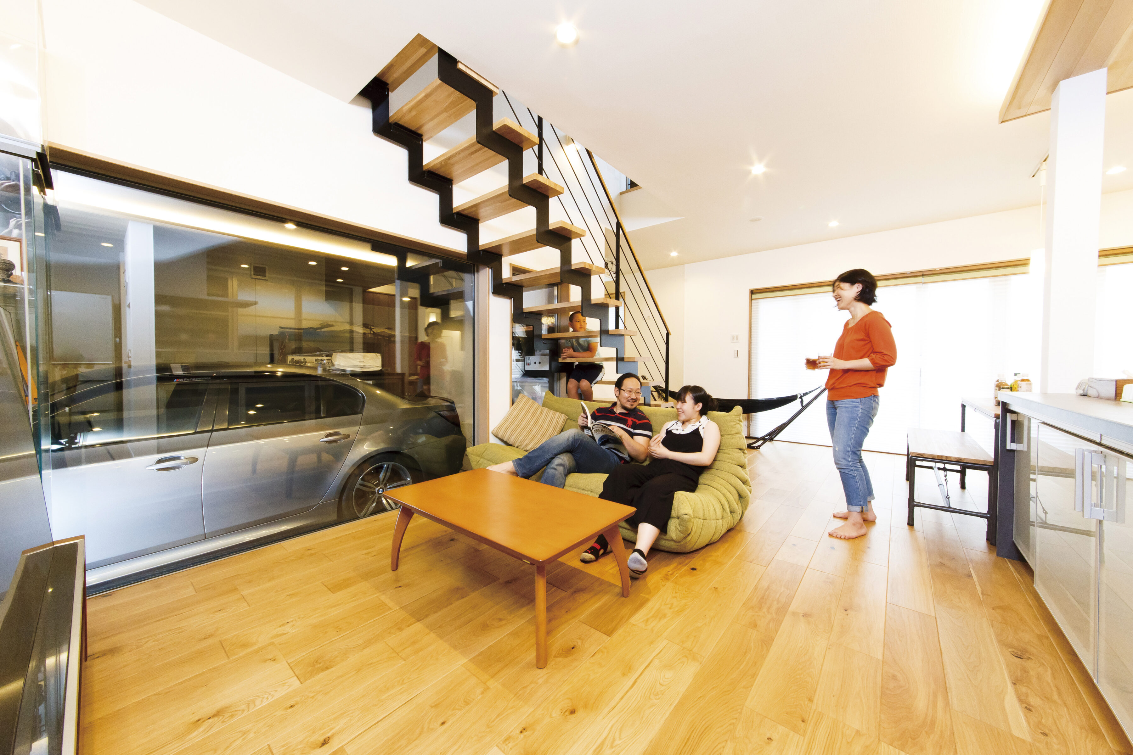 シンボリックなストリップ階段は鉄と木で造作。リビングからガラス越しに常に愛車をそばに感じながらくつろげる。