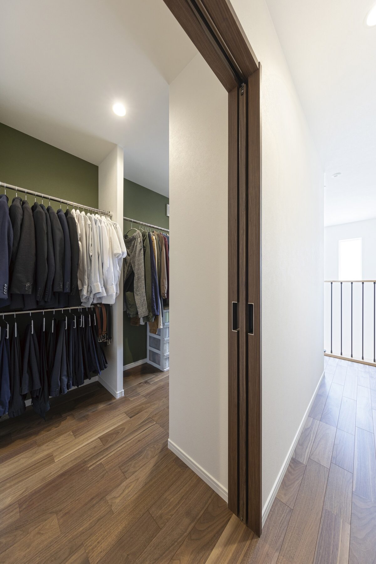 ウォークスルーができる大型の収納は、夏物・冬物問わず一気に収納!! 衣替えの作業不要でストレスゼロ。奥には作業カウンターもありラクラク。