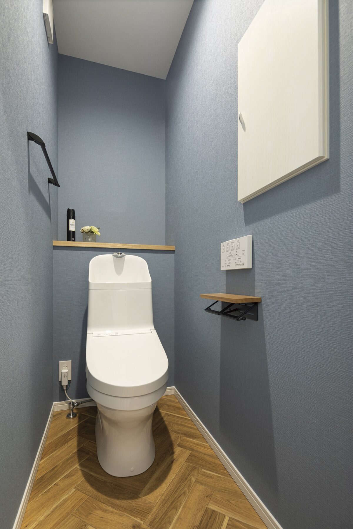 青グレーの壁紙、ヘリンボーンの床、アイアン調の小物が調和した落ち着いた空間に。
