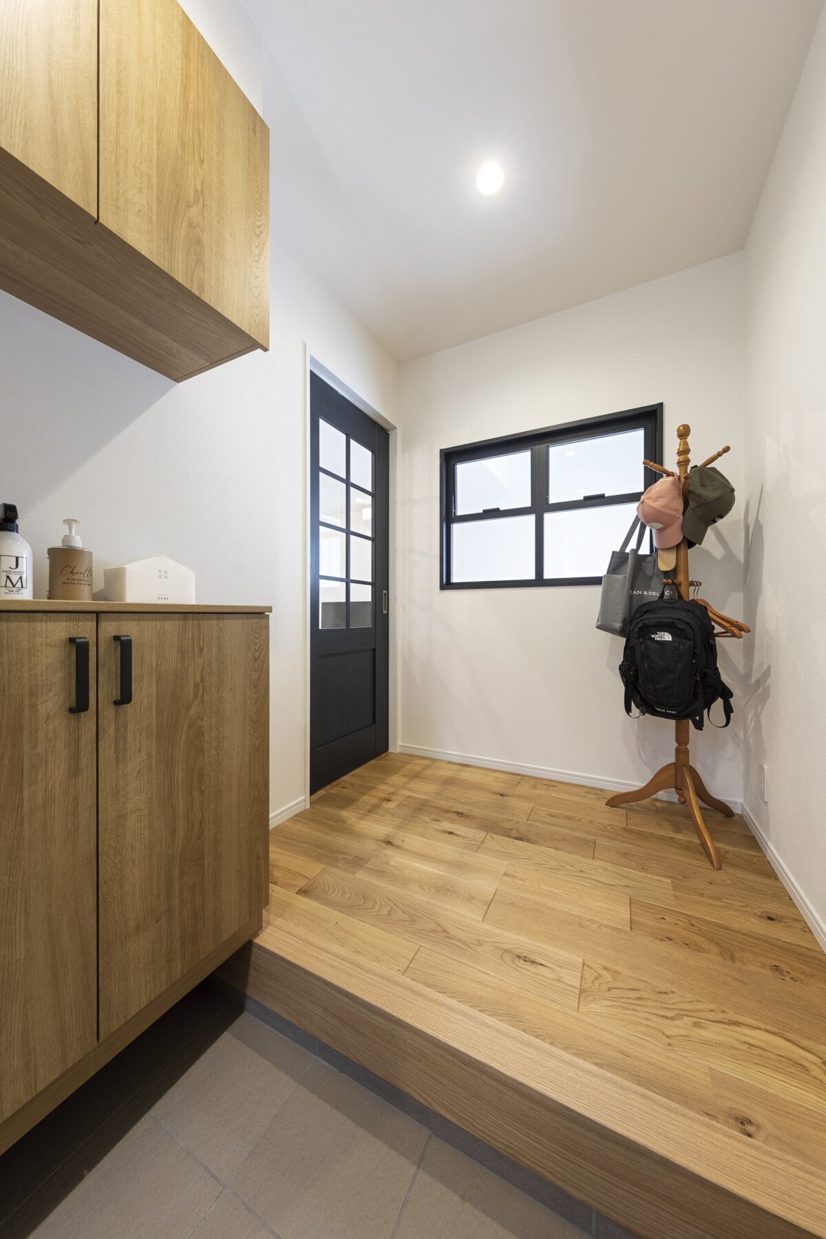ヴィンテージ窓とドアがアクセントととして映える土間スペースと壁をへだてた玄関ポーチで家に帰るとすぐに家族を感じられる。