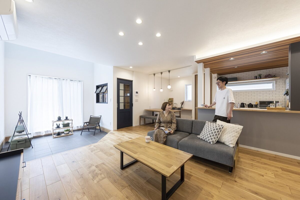 「キャンプ場のような家」は、アウトドアを趣味に持つご夫婦の憧れを実現した住まいです。プライベートキャンプ場のような雰囲気を持つこの家は、吹き抜けの土間空間をリビングに併設したプランが特徴です。一段下がった土間スペースが吹き抜けになっており、たっぷりの太陽光が降り注ぐ明るいLDKが広がります。ヴィンテージ感のあるパナソニック社製クラフトレーベルの室内窓やリビングドア、ウッドテック社製のライブナチュラルプレミアムシリーズのフローリングが全体のバランスをまとめ上げています。土間スペースと玄関を仕切るヴィンテージ感あふれる室内窓は、土埃を防ぎながらも明るい照明の光が漏れることで、家族が近くに感じられる工夫が施されています。「土間リビングの家」は、アウトドア好きの方に最適な開放感あふれる住まいに。
