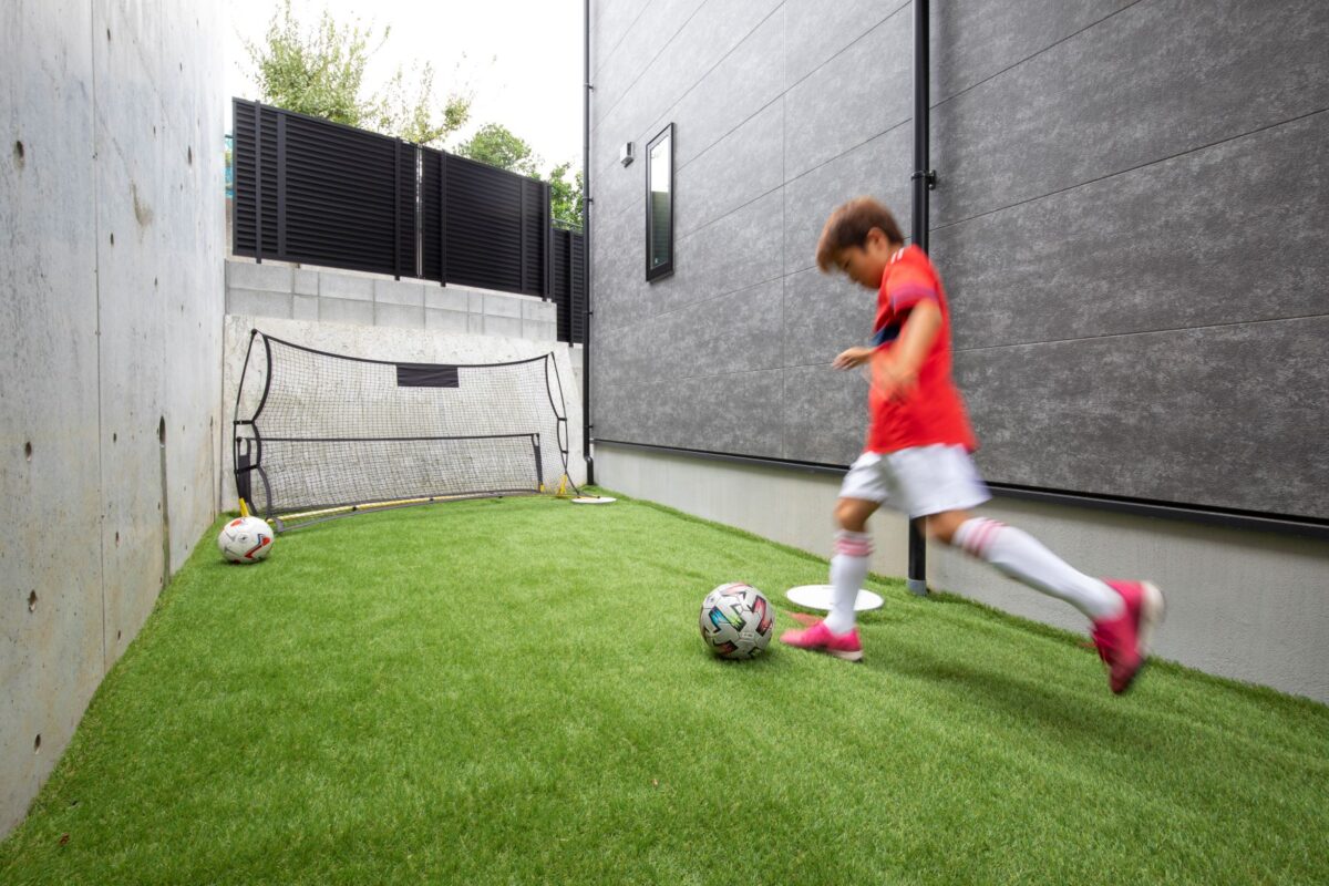 裏庭には人工芝スペースを設け、息子さんのサッカーの練習や ワンちゃんの運動スペースとして使用できる。