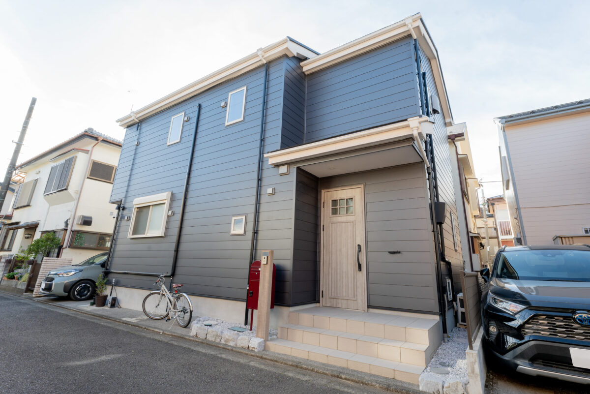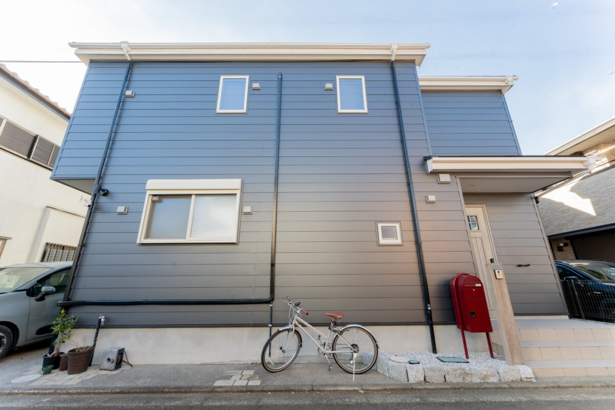 大原建設の標準仕様であるヘーベルパワーボードではなく、凹凸のある鎧張り状のラップサイディング(ガルバリウム鋼板)を選定されました。他の施工例とはまた少し違った、個性的で洗練された印象に仕上がっています。