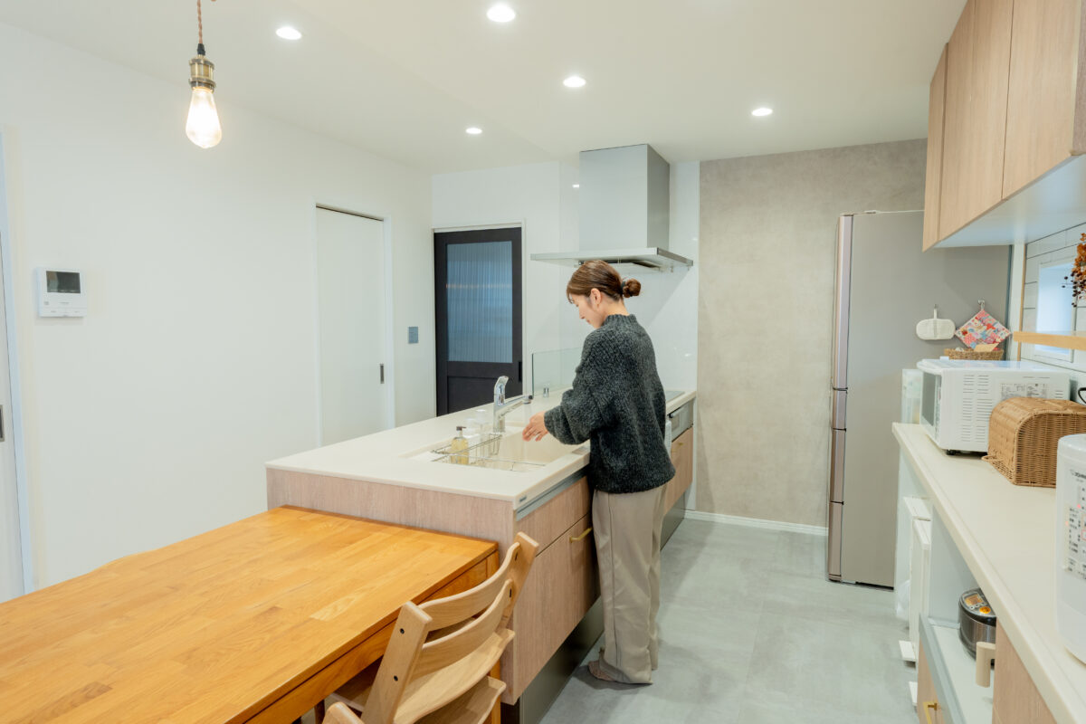 また、毎日の生活を支える水回りの家事動線にも奥様の強いこだわりが光ります。あえてLDKの広さを少し抑えてでも、家事のしやすい使い勝手を最優先。