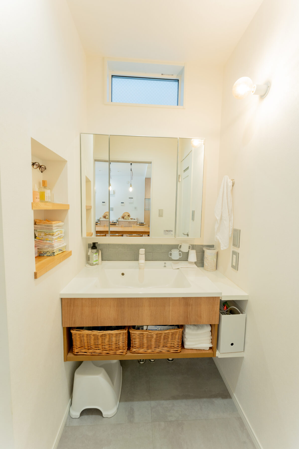 玄関からの動線に配慮し、お子様が帰宅後すぐに手を洗ってからリビングに向かえる位置に洗面所を配置しました。