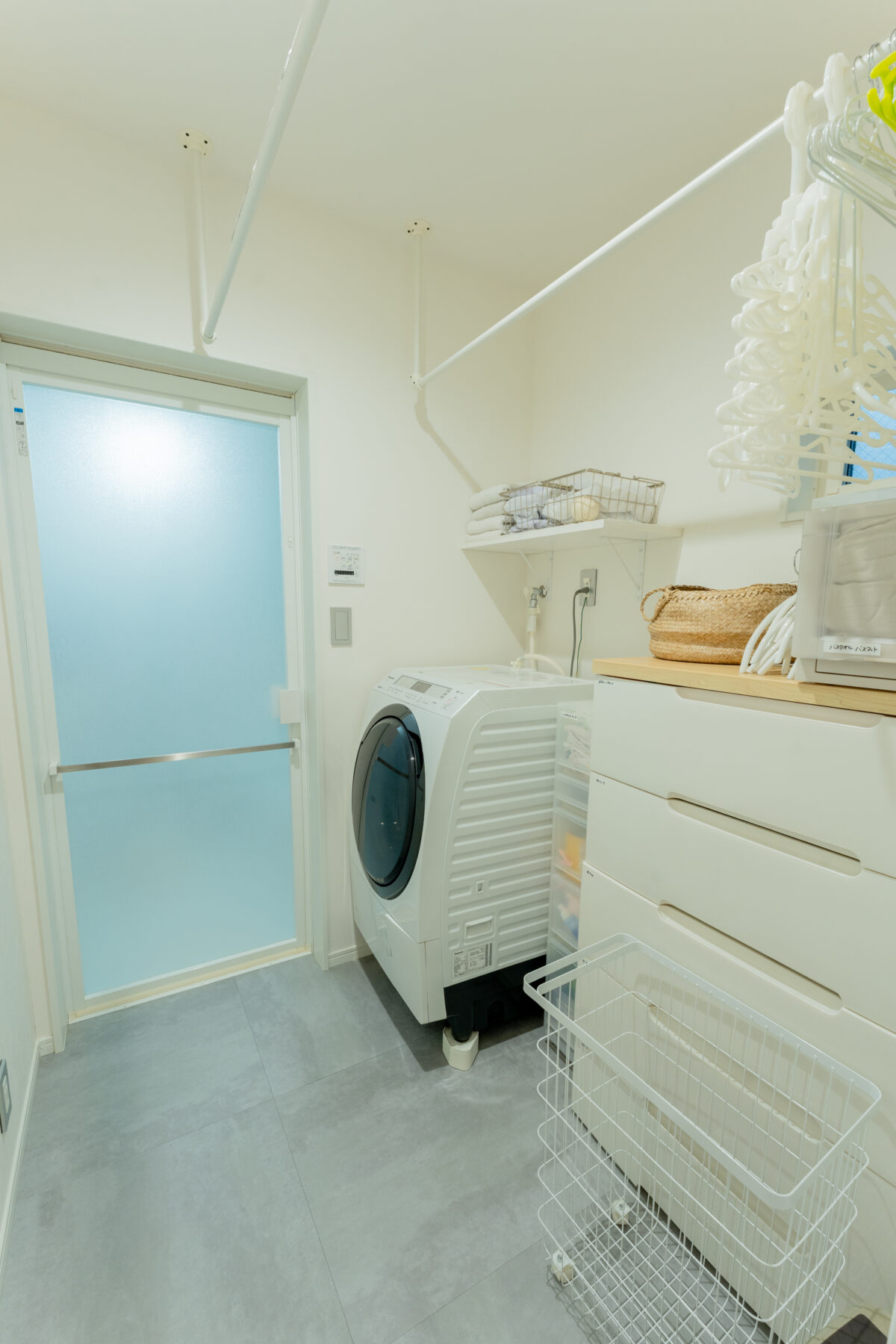 天候や時間を気にせず洗濯ができるよう、室内干し用のスペースを確保しました。