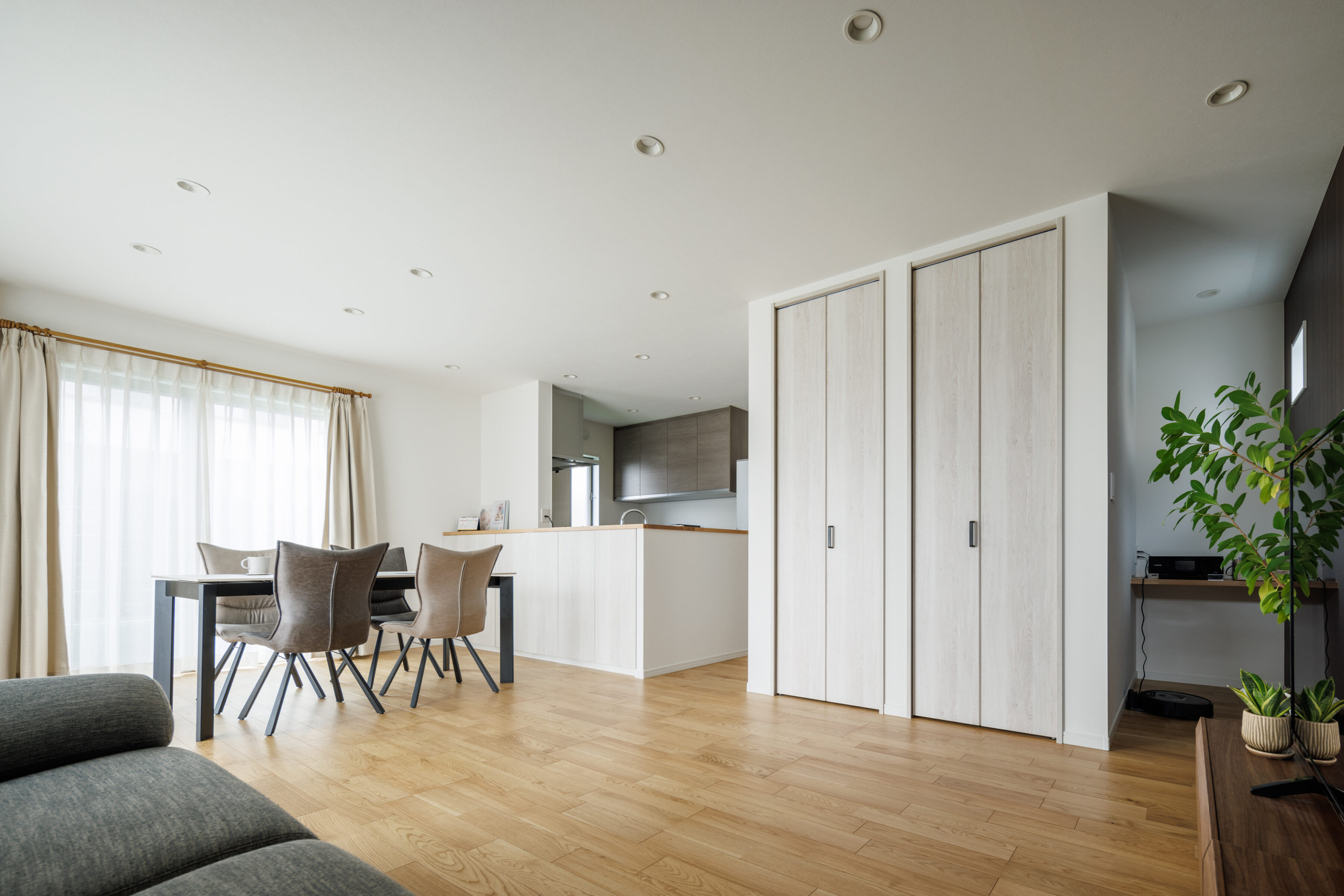 LDKにはたっぷりの収納を設け、PCコーナーとしても利用可能なワークスペースを設置しました。テレビ側の壁にはシックな色を選び、白を基調とした明るい空間にアクセントを加えることで、開放感と落ち着きを両立。