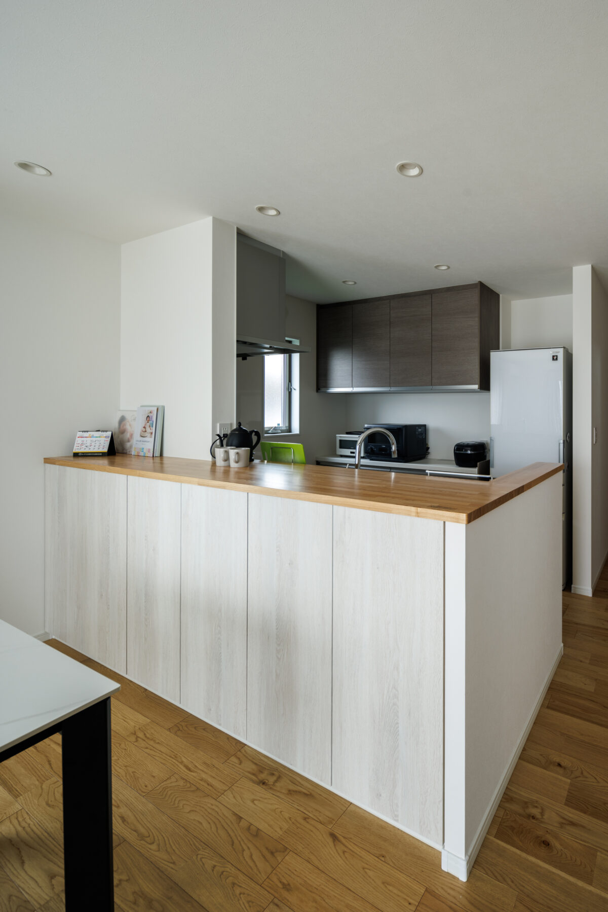 キッチンには幅広のカウンター、その下には収納を造作。扉付きで見た目もスッキリ。