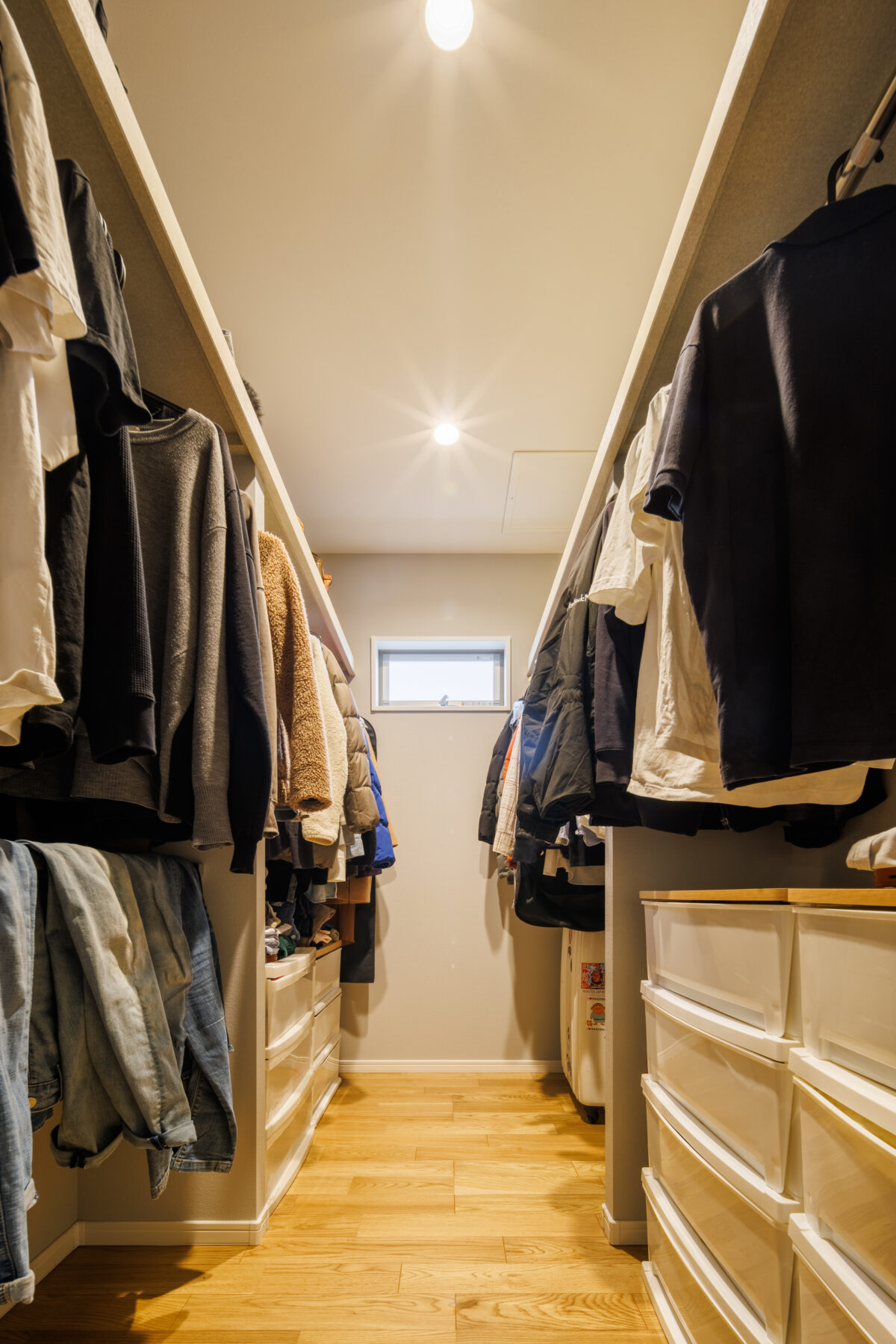 「収納たっぷりの家」では、LDKに多くの収納スペースを設け、PCコーナーとしても利用可能なワークスペースを設置しました。テレビ側の壁にはシックな色を選び、白を基調とした明るい空間にアクセントを加え、開放感と落ち着きのあるデザインを実現。キッチンには幅広のカウンターを配置し、その下には扉付きの収納を造作し、見た目もすっきりと整えています。また、玄関には靴やベビーカーなどの大型アイテムが収納できるスペースを確保し、大容量のウォークインクロゼットも完備。快適で整理整頓しやすい空間に。