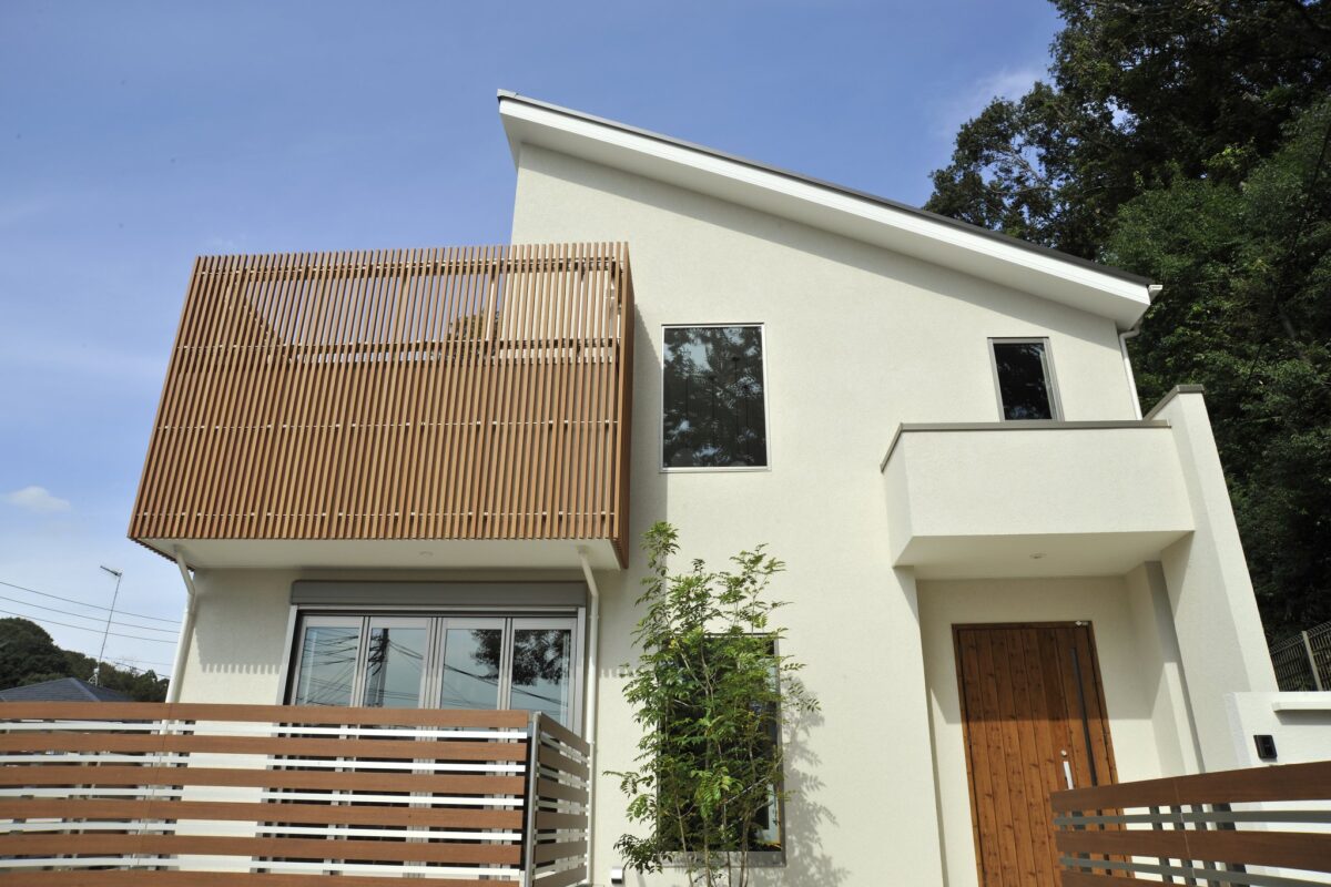 外観の最大のワンポイントともなっているルーバー手摺。あえて高く囲んでしまうことでスッキリとモダンな雰囲気に。又、プライバシーも守られているので、外からの目線を気にする事無くのびのび過ごせます。