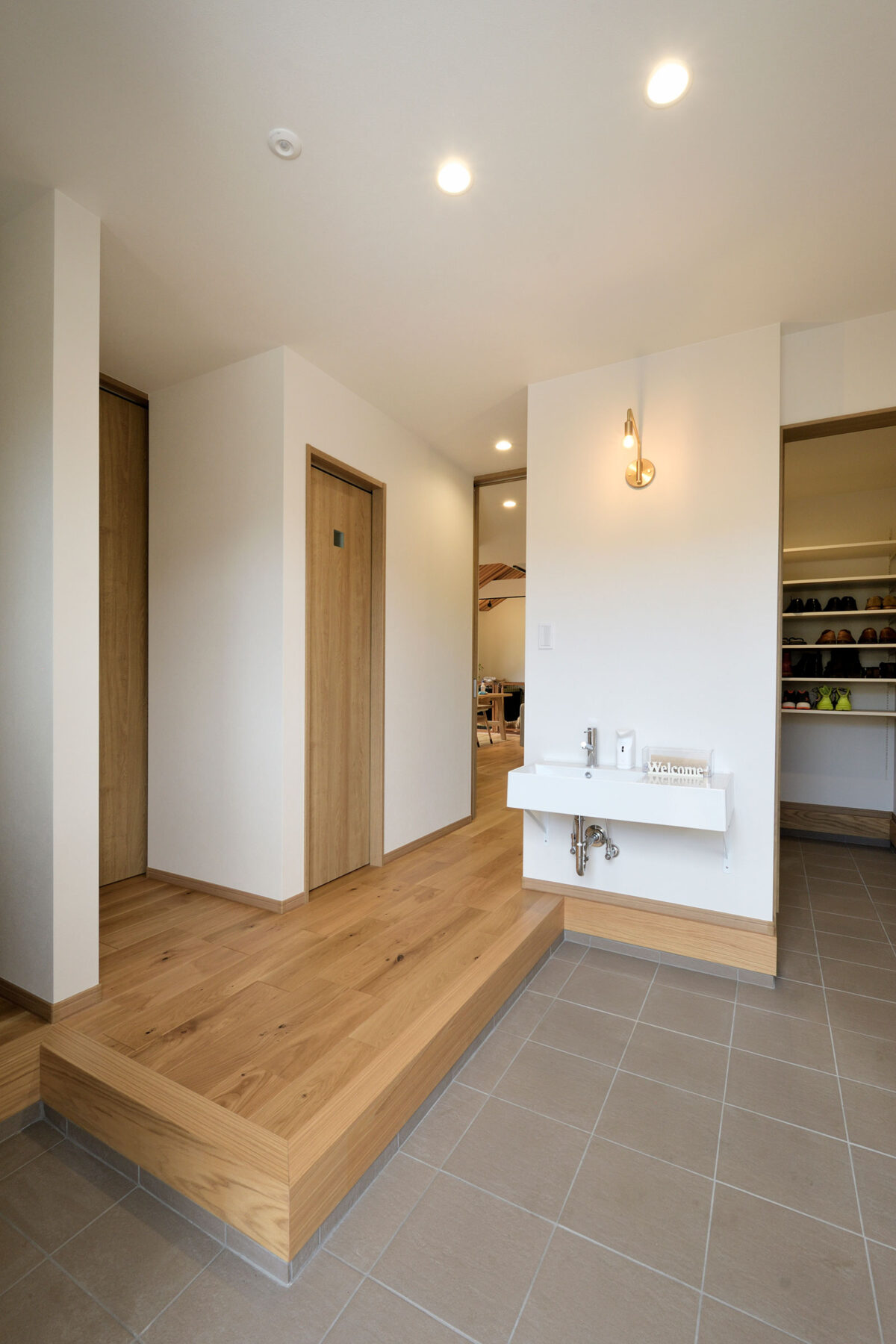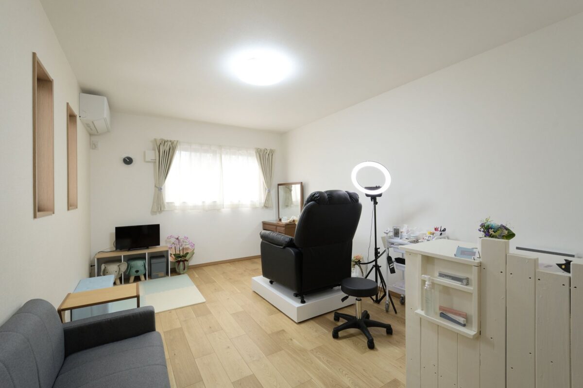 奥様が経営するプライベートサロンも併設。 プライベートサロンの入り口を兼ねる玄関には使いやすい手洗いを設置。