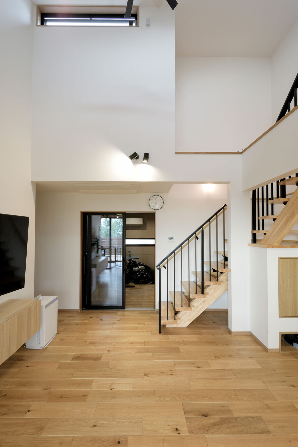 リビングから直接行き来ができるビルトインガレージは「乗るよりもいじっている時間のほうが好き」というご主人の趣味に合わせて整備も余裕の広さに。